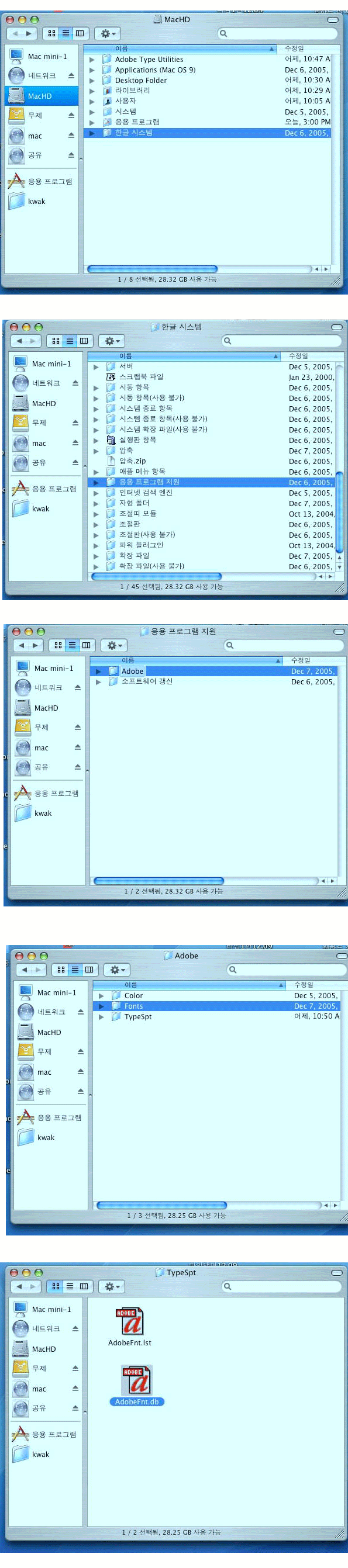일단 atm 깨진거 아닌가 의심이 가네요 그리고 서체마다 포샵과 일러 지원되는 파일들이 있습니다. 참고로 그림 올려드립니다 참고하세요 마지막에 보시는것처럼 지원되는 데이터베이스 파일들이 있을건데 그걸 폴더에서 보시는 자리에 카피하시면 아시아서체는 잘 될거라고 말씀드리것습니다.